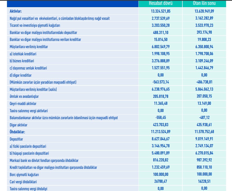 Bankın kredit porfeli isə 6 milyard 802 milyon 550 min manat təşkil edib. Bu da ötən ilin sonu ilə müqayisədə 451 milyon 749 min manat və ya 7,1% çoxdur.