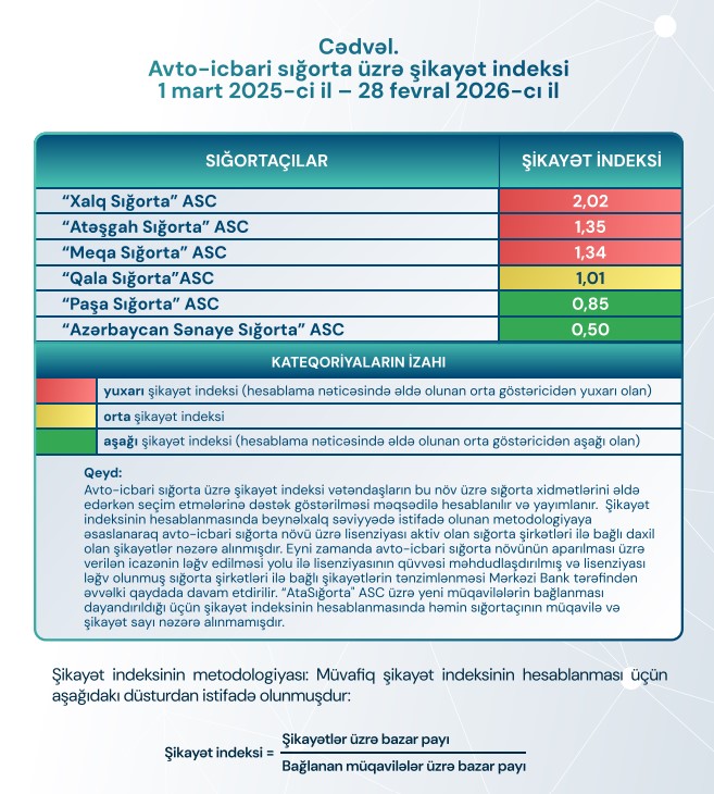 Azərbaycanda son 1 ildə (1 mart 2025-28 fevral 2026) avtomobillərin icbari sığortası üzrə ən çox şikayət edilən şirkət "Xalq Sığorta" (2.02 indekslə) olub.