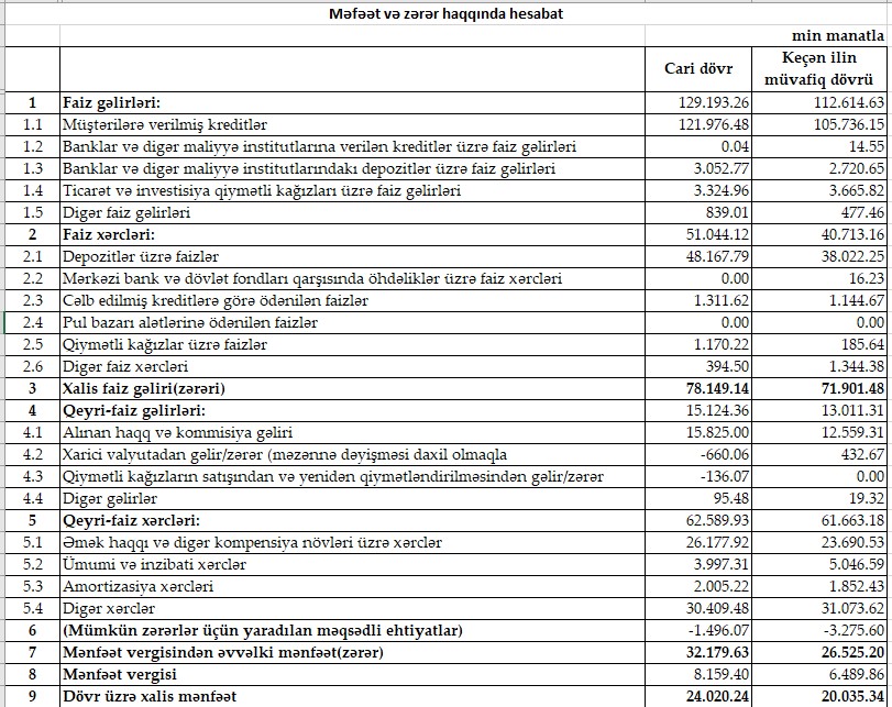 Hesabat dövründə bankın faiz gəlirlərinin məbləği illik müqayisədə 16 milyon 579 min manat (14,7%) artaraq 129 milyon 193 min manata, faiz xərclərinin həcmi isə 10 milyon 331 min manat (25,4%) artaraq 51 milyon 44 min manata yüksəlib.