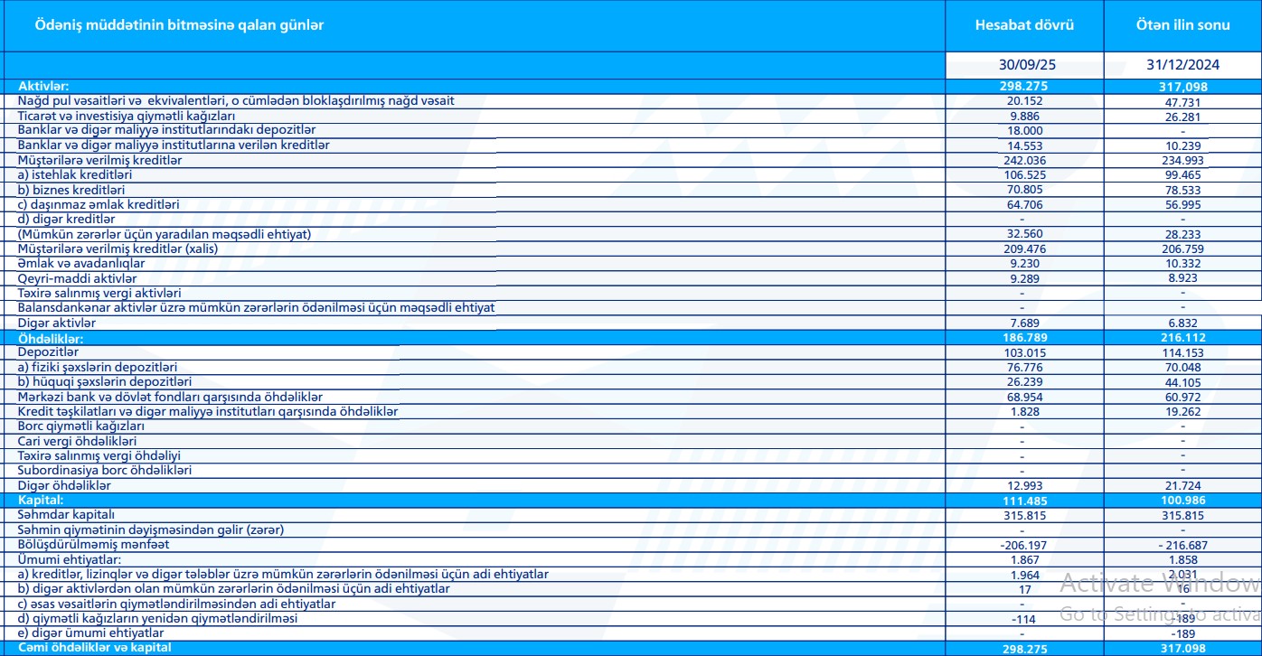 Hesabata görə, 2025-ci ilin 30 sentyabr tarixinə bankın aktivlərinin həcmi 298 milyon 275 min manat olub.
