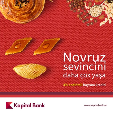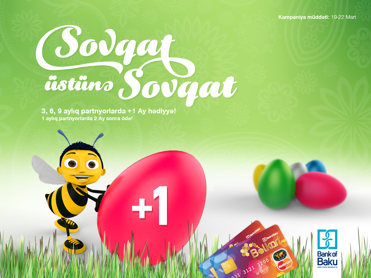 Bank of Baku Azərbaycan xalqını qarşıdan gələn Novruz bayramı münasibətilə təbrik edir və bayram ilə əlaqədar 19-22 mart tarixləri arasında Bolkart sahibləri üçün bayram kampaniyasını elan edir. Kampaniyanın şərtlərinə görə qeyd olunan tarixlərdə “3,6,12 aya ödə” partnyorlarında alış-veriş edən Bolkart sahibləri əlavə olaraq 1 aylıq ödəmə imkanını qazanacaq və beləlilkə də 3 aylıq ödəməni 4 aya, 6 aylıq ödəməni 7 aya, 12 aylıq ödəməni isə 13 aya həyata keçirəcək. “1 aya ödə” partnyorlarında isə “indi al 2 ay sonra” kampaniyası keçərli olacaq. Mart ayında alış –veriş edənlər, ödəməni May ayının 10-dək əlavə xərcsiz etmək imkanını əldə edəcəklər.