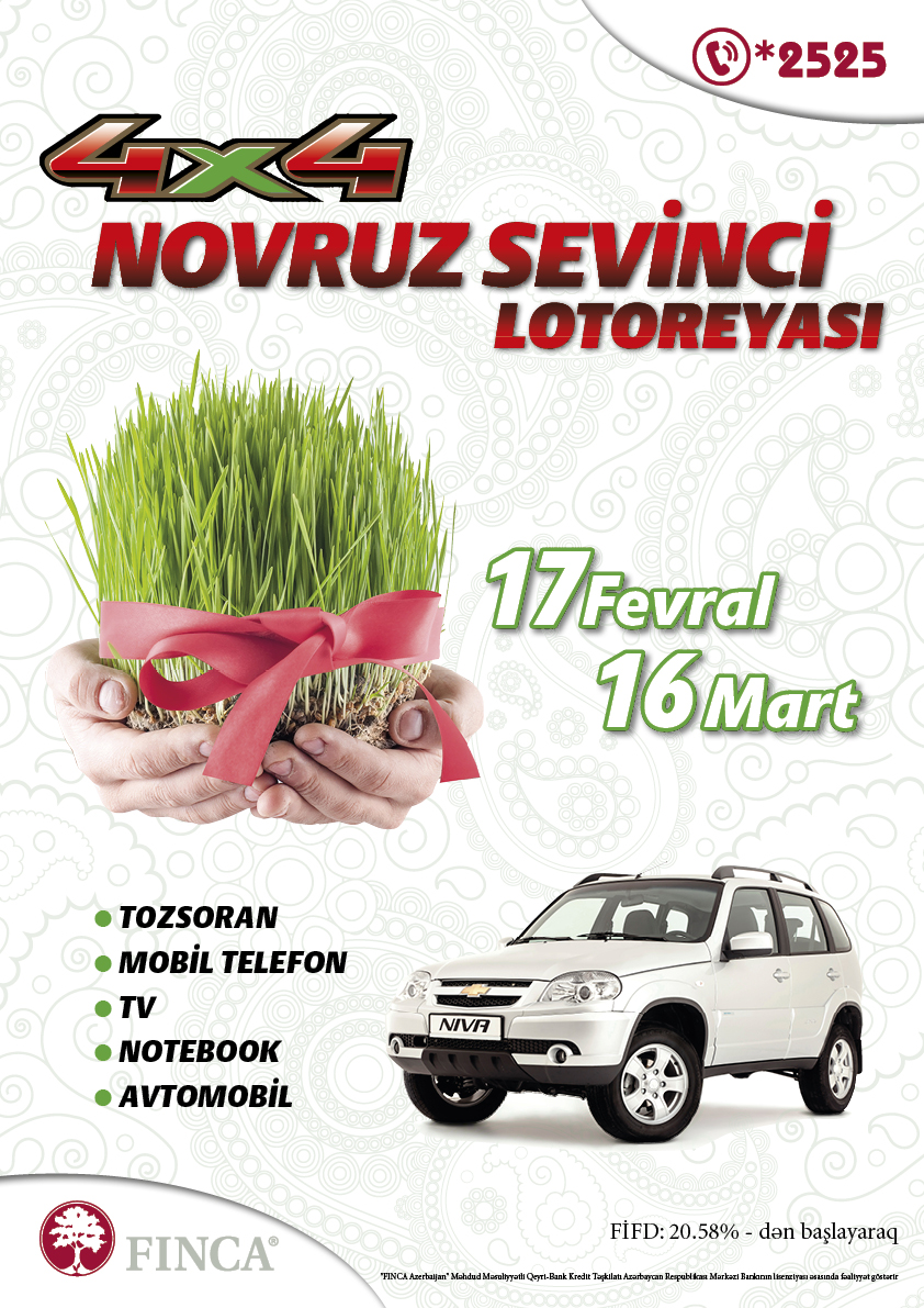 “FINCA Azerbaijan” Qeyri-Bank Kredit Təşkilatı müştəriləri üçün “4x4 Novruz Sevinci” adlı stimullaşdırıcı lotereyaya start verdi. Mütəmadi olaraq müştərilərinə yönəlik kampaniyalar, stimullaşdırıcı lotereyalar təşkil edən təşkilat bu dəfə Novruz Bayramı ərəfəsində müştərilərin sevincinə səbəb olacaq. Belə ki, 17 fevral – 16 mart tarixlərində FINCA Azerbaijan-dan kredit götürən müştərilərin Novruz çərşənbələrində 65 ədəd dəyərli hədiyyə qazanmaq imkanı olacaq. İlaxır çərşənbəsində isə bir nəfər şanslı müştəri uduş fondunun ən dəyərli hədiyyəsi olan avtomobil qazanacaq.