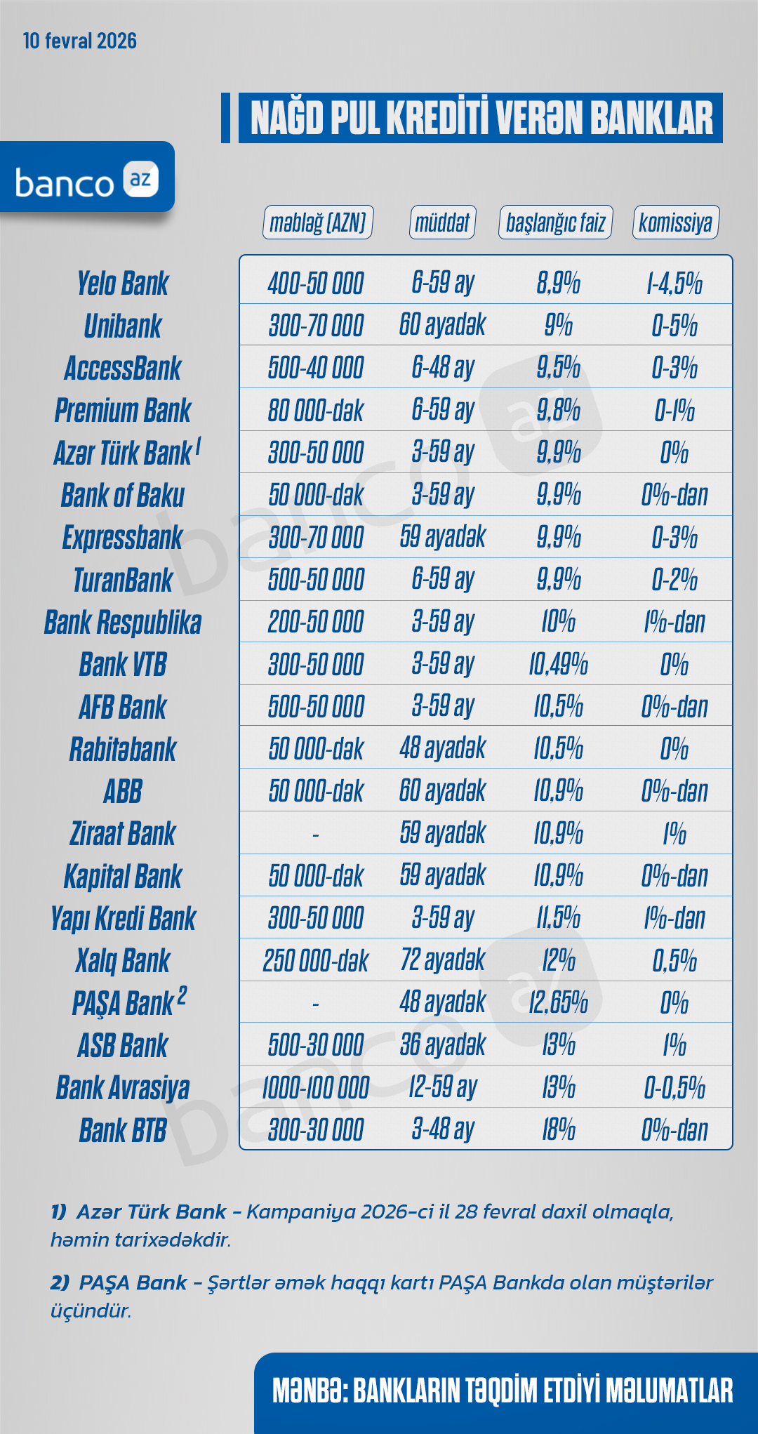 Banco.az 2026-cı ilin fevral ayında sərfəli şərtlərlə kredit götürə biləcəyiniz bankları araşdırıb. Araşdırmamıza görə, hazırda banklar arasında ən aşağı faizi "Yelo Bank" (8,9%), ən yüksək faizi isə "Bank BTB" (18%) təklif edir.