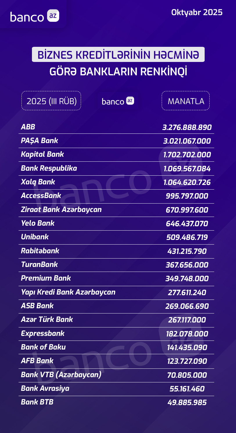 Banco.az bu məqalədə bankların biznes kreditləri portfelinin həcminə görə renkinqini hazırlayıb. Renkinqə 3 milyard 276 milyon manatlıq göstərici ilə ABB liderlik edir. İkinci ən böyük paya sahib bank PAŞA Bank (3 milyard 21 milyon manat), üçüncü isə Kapital Bank-dır (1 milyard 702 milyon manat).
