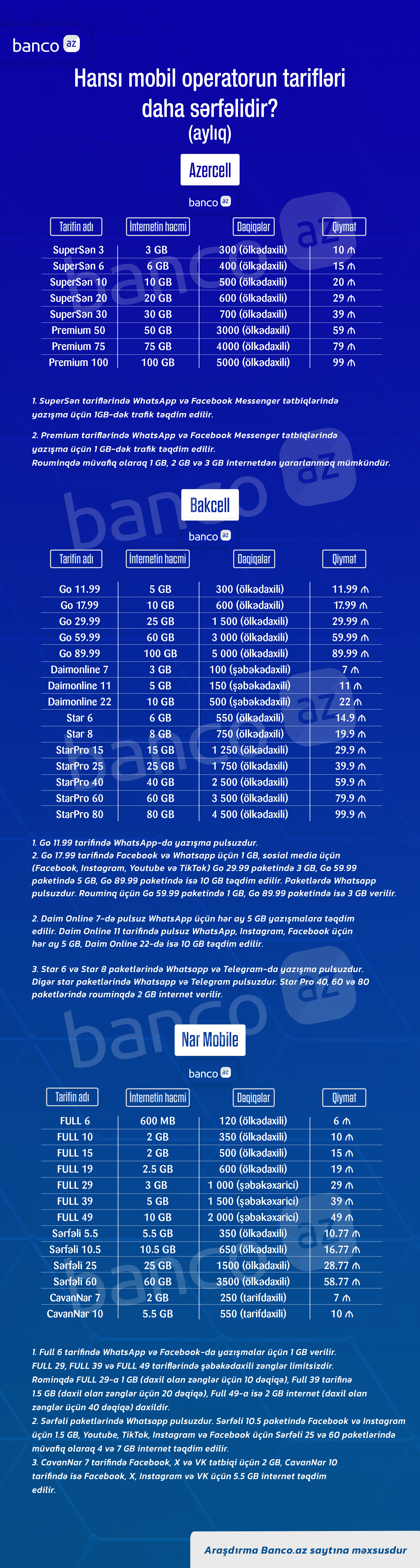Müştərilər mobil operator seçimi edərkən ən yaxşı xidmətdən yararlanmaq istəyirlər. Bu səbəblə mobil operatorların ("Azercell", "Bakcell" və "Nar Mobile") tariflərini, internet paketlərini, rouminqdə internet paketlərini araşdırdıq.