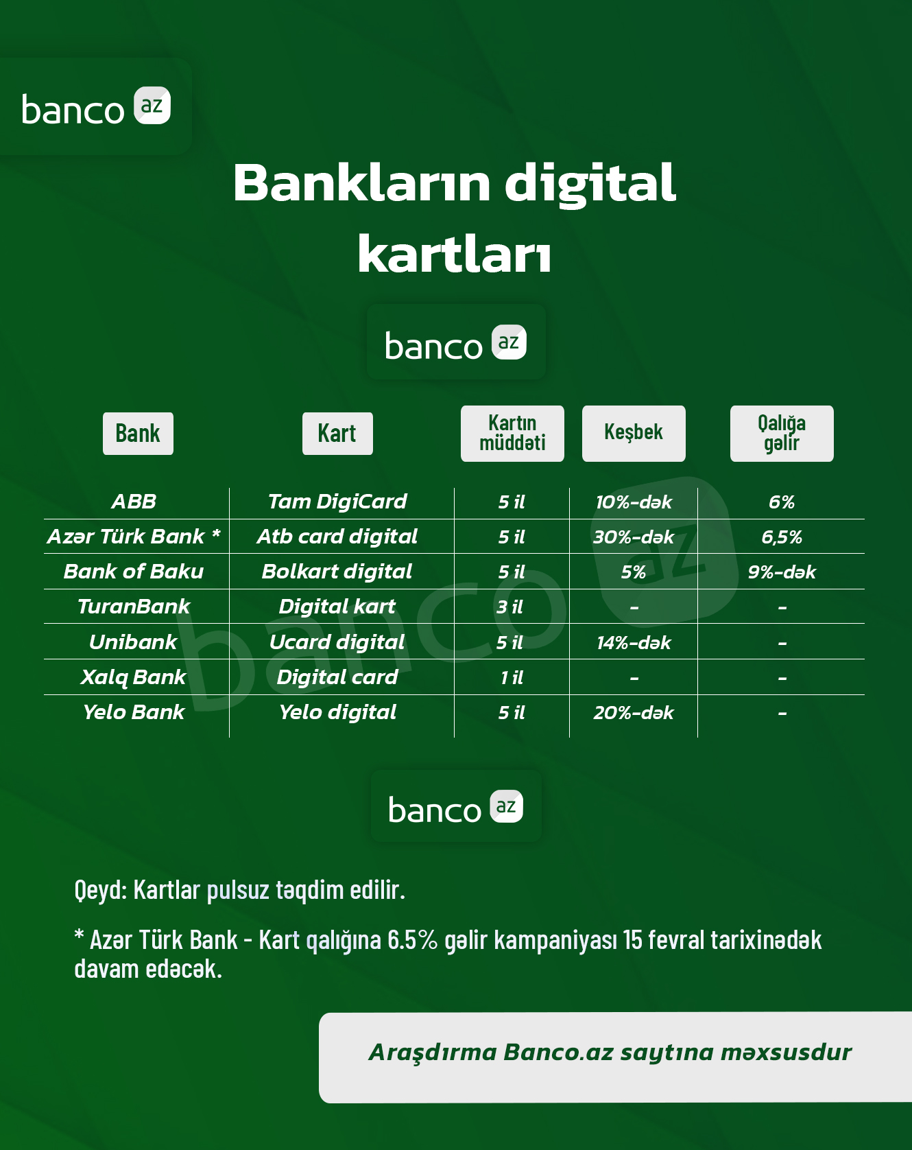 Digital kart verən banklar və onların şərtləri ilə cədvəldən tanış ola bilərsiniz.