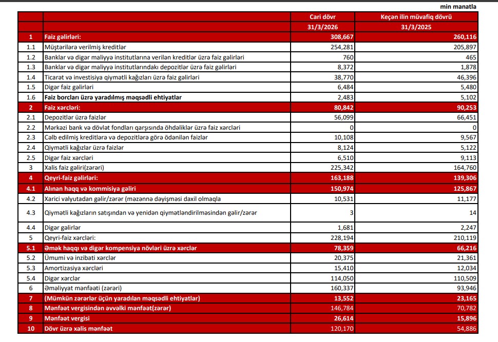 "Kapital Bank"ın xalis mənfəəti 2026-cı ilin birinci rübündə 120 milyon 170 min manat təşkil edib. Bankın xalis mənfəəti illik müqayisədə 65 milyon 284 min manat və ya 2,2 dəfə artıb.