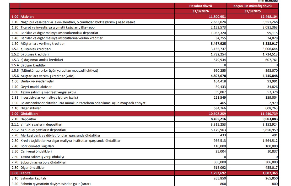 Bankın kredit portfeli 2025-ci ilin eyni dövrü ilə müqayisədə 129 milyon manat (2,4%) artıb.