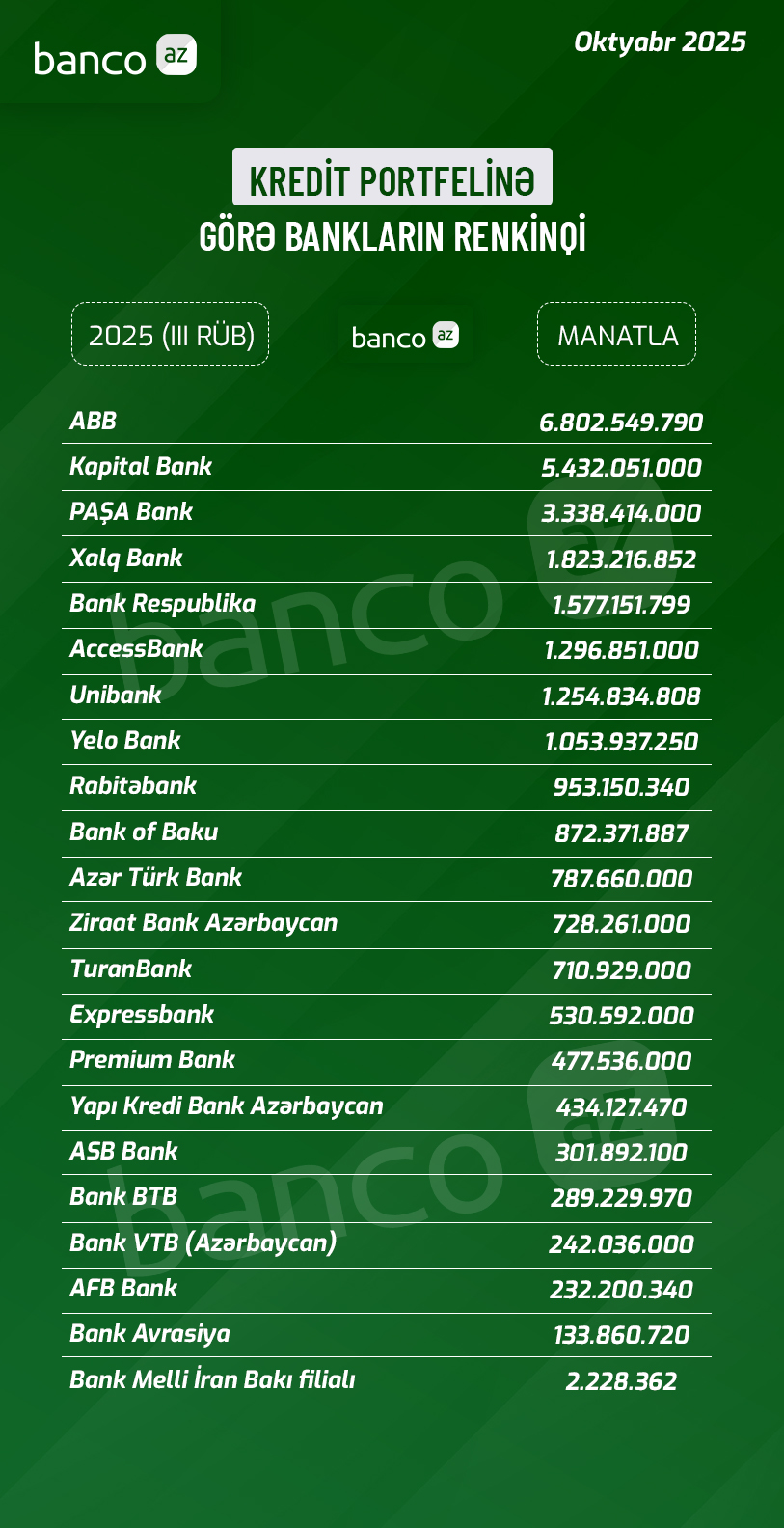 Banco.az ölkə banklarının kredit portfelinin həcminə görə renkinqini hazırlayıb. Renkinqdə Azərbaycan Beynəlxalq Bankı (6 mlrd. 802 mln. manat) ilk sırada qərarlaşıb: