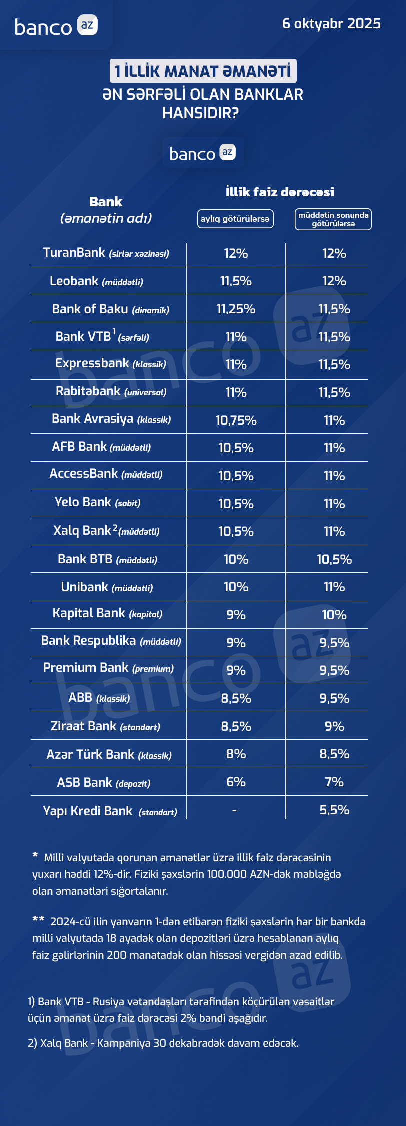 Banco.az bankların 2025-ci ilin oktyabr ayı üzrə təklif etdikləri depozit faizlərini araşdırıb.