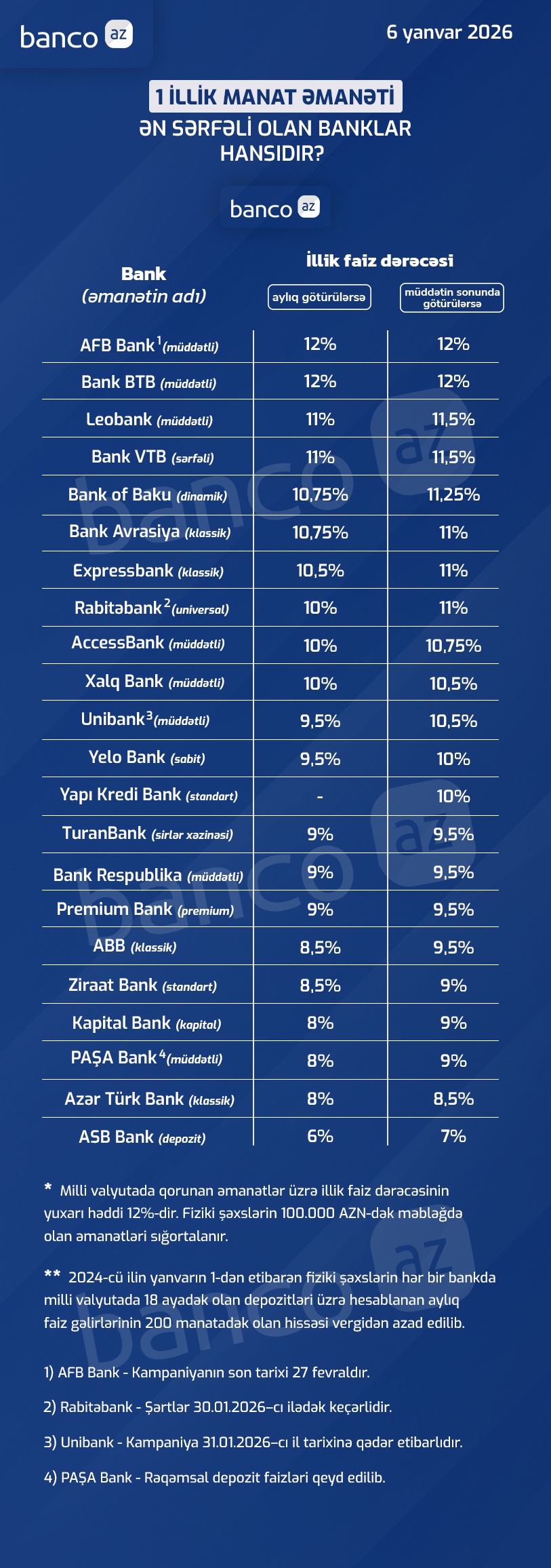 Banco.az bankların 2026-cı ilin yanvar ayı üzrə təklif etdikləri depozit faizlərini araşdırıb.