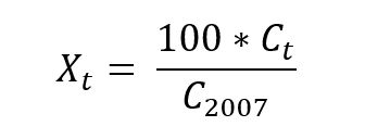 Burada X müəyyən il üçün indeksin dəyərini, C isə istehlak miqdarını göstərir. Beləliklə, 2007-ci il üçün indeksin dəyəri 100-ə bərabər olmuş olur.