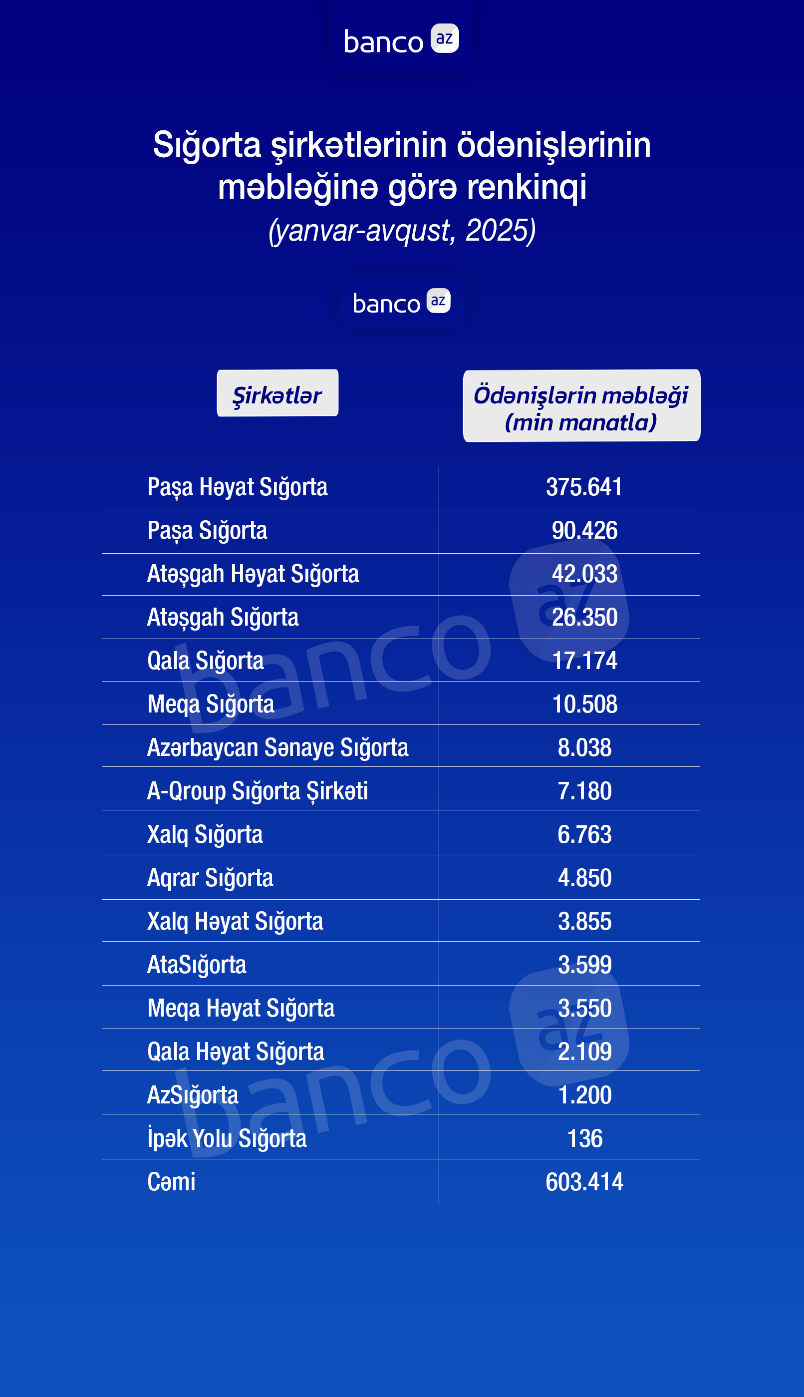 Banco.az sığorta şirkətlərinin ödənişlərinin məbləğinə görə renkinqini təqdim edir: