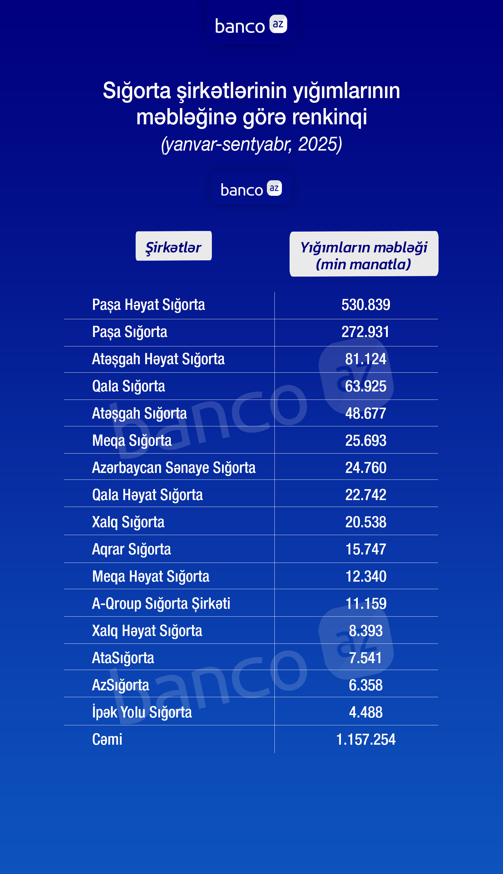 Banco.az sığorta şirkətlərinin yığımlarının məbləğinə görə renkinqini təqdim edir: