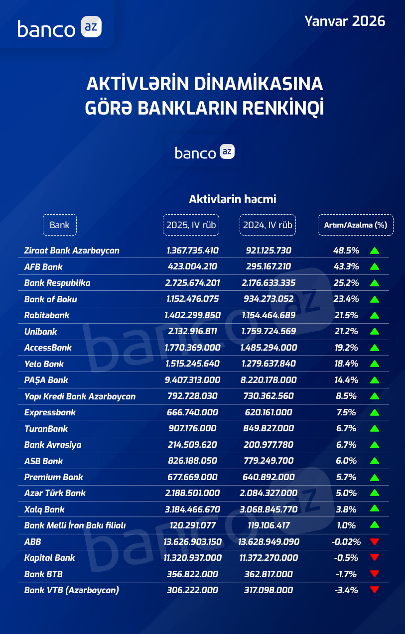 Bu məqalədə ölkədə fəaliyyət göstərən bankların aktivlərinin (2024 IV rüb-2025 IV rüb) dinamikasına görə renkinqini hazırlamışıq. Son 1 ildə aktivlərini ən çox artıran bank Ziraat Bank Azərbaycan olub.