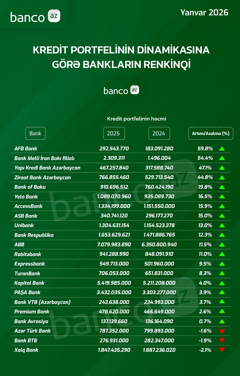 Bankların kredit portfelinin (2024-2025) dinamikasına görə renkinqini hazırladıq. Son 1 ildə kredit portfelini ən çox artıran bank AFB Bank olub.